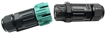 Kabelverbinder IP68 mit Schnellverschlussstecker M19 Kabelverbinder mit Schnellverschluss-Stecker und Schraubanschluss, male/female für 3 adrige Schlauchleitungen 0,5-2,5mm², Kabeldurchmesser 7-10mm mit Schraubanschlüssen, Schutzart IP68, Gehäusefarbe schwarz/türkis
