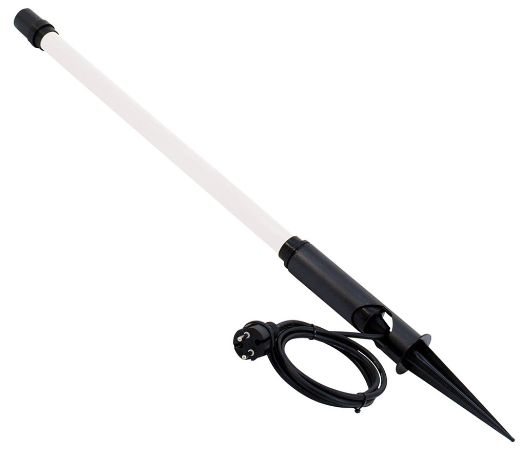 Leuchtstab 60x60x1540mm Farbige Leuchtstoffröhre T8 weiß, 36W, zum Einsatz im Eingangsbereich von Discotheken, Partykeller etc., sichtbares Licht 85cm, anschlussfertig mit Netzleitung und Eurostecker, inkl. Erdspieß – Outdoor. Energieeffizienzklasse: Auslauftype, nicht kennzeichnungspflichtig