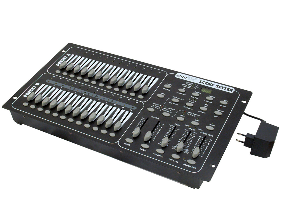Lichtsteuerung DMX Scene Setter DMX Scene Setter, 24 Steuerkanäle, insgesamt 48 speicherbare Programme über 4 Pages, 12 Szenen können direkt über Fader aufgerufen werden, Black-Out Funktion, Musiksteuerung über eingebautes Mikrofon oder Line In Anschluss, Controller kommt ohne vorprogrammierte Chaser, Rackeinbau mit 6 Höheneinheiten, Spannungsversorgung über mitgeliefertes 12V/DC 500mA Netzteil Energieeffizienzklasse: nicht kennzeichnungspflichtig