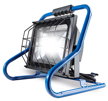 Mobiler LED Displaystr. 390x320x375mm mobiler Strahler mit LED Chip, schmale Bauform mit zwei Schutzkontaktsteckdosen, blaues Gestell und schwarzes Schutzgitter, 3 m Gummischlauchleitung H07RN-F 3G1,5 mit Schutzkontaktstecker Energieeffizienzklasse: enthält fest verbaute LED mit EEK F Quecksilbergehalt (mg): 0